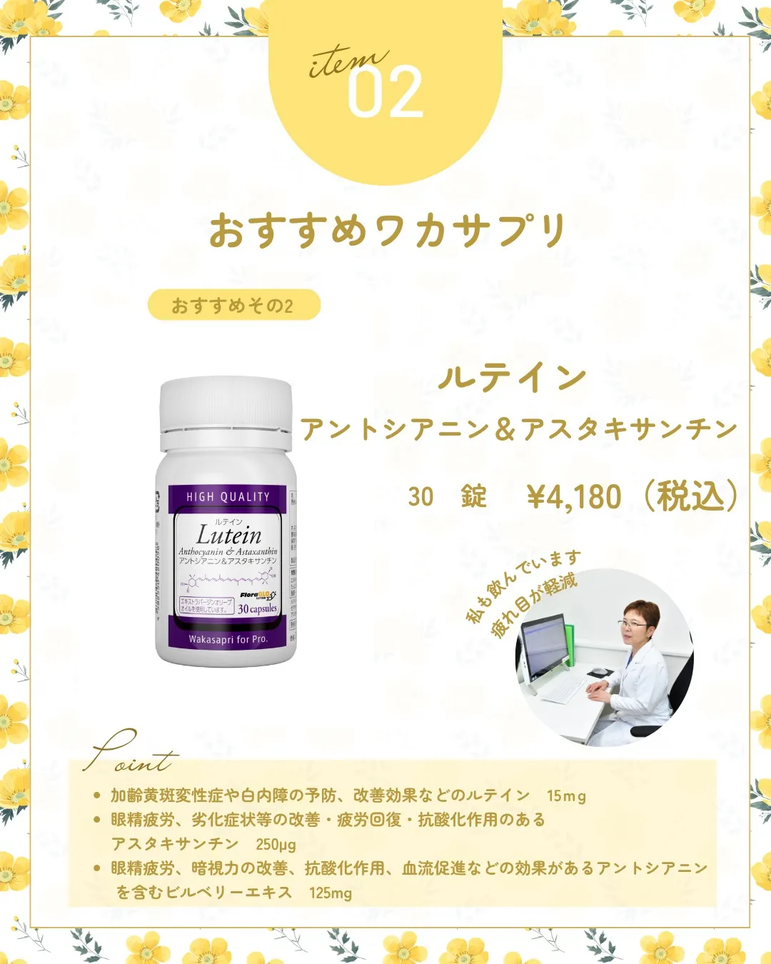 目の健康を守るためのサプリメント、日々の生活にいかがでしょうか?おすすめワカサプリ第二弾は、目の健康維持に役立つ成分を豊富に含んだサプリです。