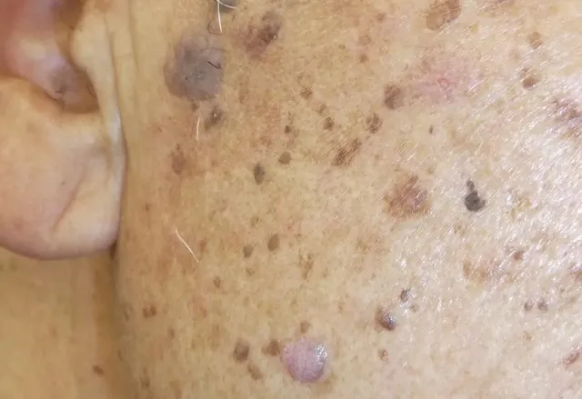 ・脂漏性角化症(老人性いぼ):茶色から黒色のひょめんがざらざらして、やや盛り上がったものです。40代ごろより現れ、80代ではほとんどの方にみられます。紫外線や加齢、遺伝的要因が原因とされています。