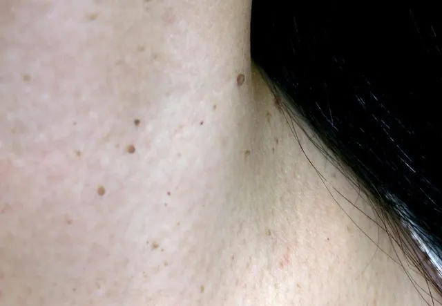 ・軟性線維腫(アクロコルドン・スキンタッグ):首や瞼、わきの下、鼠径部など擦れる部分に多く、1~3ミリ大で褐色~皮膚色のいぼです。ドーム状から有茎性の小腫瘤です。摩擦や、紫外線、加齢、遺伝的要因が原因とされています。