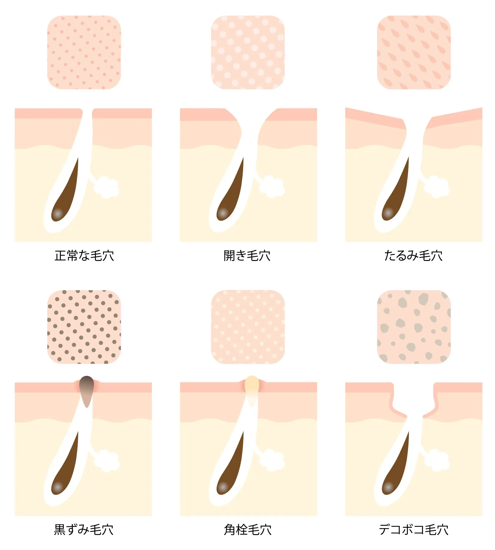 加齢や紫外線の影響でコラーゲンやエラスチンなどの弾性線維が減少し、肌の弾力やハリがなくなることにより、毛穴の形が重力によって楕円形に変形し、毛穴同士がつながったように見える毛穴です。頬や鼻周りに多く見られ、肌のたるみとともに毛穴が目立つようになります。30代以降の乾燥肌や敏感肌でよく見られます。
